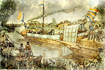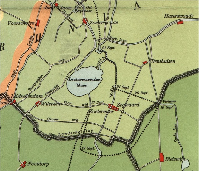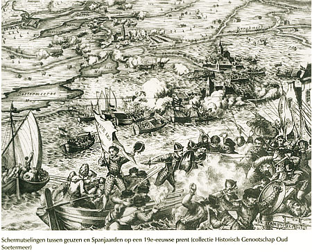 Het ontzet van LeidenDe Tachtigjarige Oorlog heeft ook Zoetermeer niet onberoerd gelaten. In september 1574, toen de Maasdijken op bevel van de prins van Oranje waren doorgestoken en het gehele gebied tussen Maas en Rijn blank stond, voeren de watergeuzen onder leiding van Boisot op platbodems richting Zoetermeer. Ten zuiden van Zoetermeer lag namelijk de eeuwenoude Landscheidingsdijk tussen Delfland en Rijnland, waarop de Spanjaarden zich verschanst hadden. Na de nodige schermutselingen werden de Spanjaarden door de geuzen verslagen, de dijken doorgestoken en konden de geuzen door de Zoetermeerse polder verder varen. Een volgend obstakel vormde echter de Voorweg in Zoetermeer, die door de Spanjaarden was bezet en te hoog was om onder water te lopen.De Zoetermeerder Wolfert Adriaanszoon, wees de geuzen een sluiproute en met een omtrekkende beweging bereikten ze toen het Zoetermeerse meer. Vandaar was het een peulenschil om bij Leiden te komen en de Spanjaarden boden hoegenaamd geen weerstand meer. De gevolgen zijn bekend: op 3 oktober werd Leiden ontzet en dit wordt nog jaarlijks gevierd. | AfbeeldingenStadsgeschiedenis |