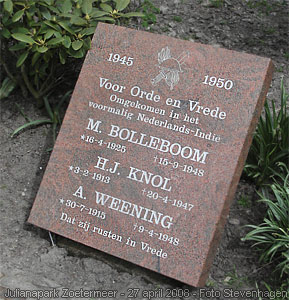 Indiëgangers Na het uitroepen van de republiek Indonesia in 1945, voelde de Nederlandse regering zich genoodzaakt militair in te grijpen in de voormalige kolonie Nederlands-Indië. De opdracht aan de ongeveer 140.000 uitgezonden militairen, jongens maar ook meisjes, luidde: “herstel van orde en vrede”. Behalve beroepssoldaten gingen ook vrijwilligers naar Indië, waarvan 12 jonge mannen uit Zoetermeer. Twee van hen, Henk Knol en Arend Weening, kwamen daar om het leven, evenals de militair Martinus Bolleboom uit Zoetermeer.