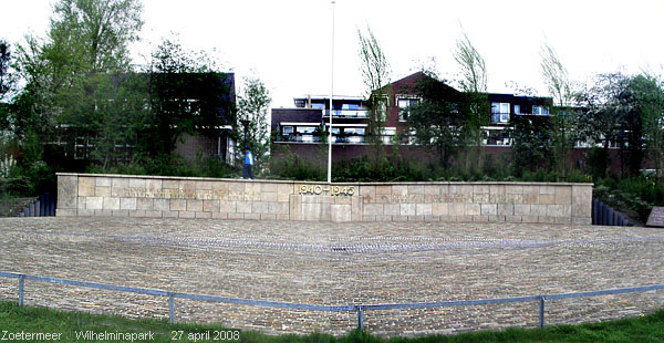 Het Wilhelminapark, herdenkingspark Met de grafsteen voor de Oude Kerk was de zaak rondom het "passende monument" nog niet afgedaan. In het uitbreidingsplan van de gemeente was voorzien in een plantsoen ten zuiden van de Dorpsstraat en in 1948 gingen de gedachten uit naar een herdenkings- of bevrijdingspark. Voor het ontwerp daarvan werd prof.dr.ir. J.P.T. Bijhouwer aangezocht. Deze landschapsarchitect was al in 1945 door oud-burgemeester Middelberg aanbevolen. De professor maakte een globaal plan en liet de verdere uitwerking daarvan over aan de tuinarchitect J.H.R. van Koolwijk. In augustus 1949 ging de gemeenteraad akkoord met een krediet van 20.500 gulden voor de aanleg van het park. De Heidemaatschappij werd ingeschakeld voor een gedetailleerde begroting. Vervolgens schreef het college van b. en w. een subsidieverzoek aan de Rijksdienst voor de uitvoering van werken. Door de aanleg van een plantsoen zou "het dorpsbeeld niet weinig worden verfraaid" en bovendien bestond volgens het college in het polderlandschap grote behoefte aan enig natuurschoon. De D.U.W. beschikte gunstig, hetgeen betekende dat 90% van de loonkosten kon worden gesubsidieerd. De ingezette werklozen togen aan het werk en gedurende de jaren 1950-1951 werden de volkstuintjes die nog ter plekke aanwezig waren, herschapen in een weids parkje met vijver. De indeling die professor Bijhouwer voorstond, is tot op heden gehandhaafd, evenals het grootste deel van de beplantingsvoorstellen, die voor rekening van Van Koolwijk kwamen. Enkele van de oudste bomen in het park dateren wellicht al uit 1950. De gemeenteraad gaf het park in 1950 de naam Wilhelminapark, aansluitend op de in aanbouw zijnde Oranjebuurt.